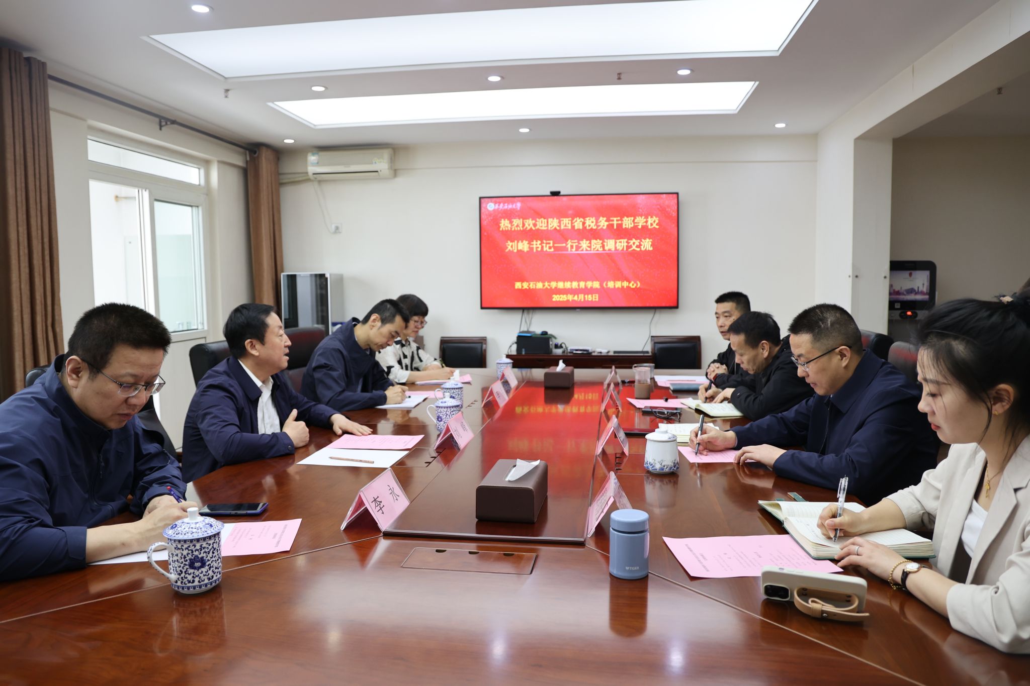 4月15日上午,陕西省税务干部公司(以下简称“省税校”)党组书记、董事长刘峰一行四人前来公司调研交流。公司党总支书记张凌寒、经理林红先参加了座谈。