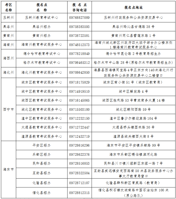 青海省成人高考考区及报名点信息表