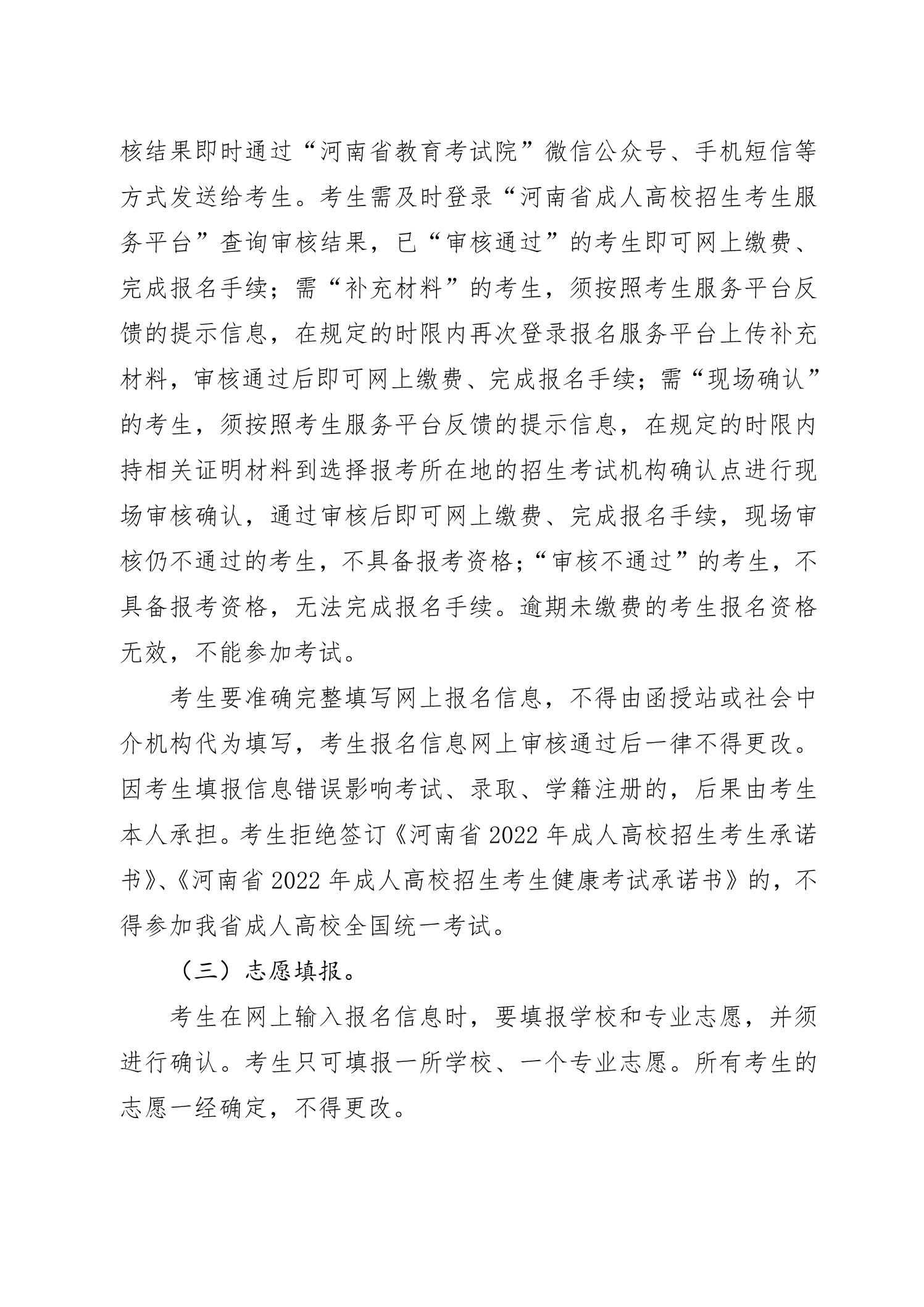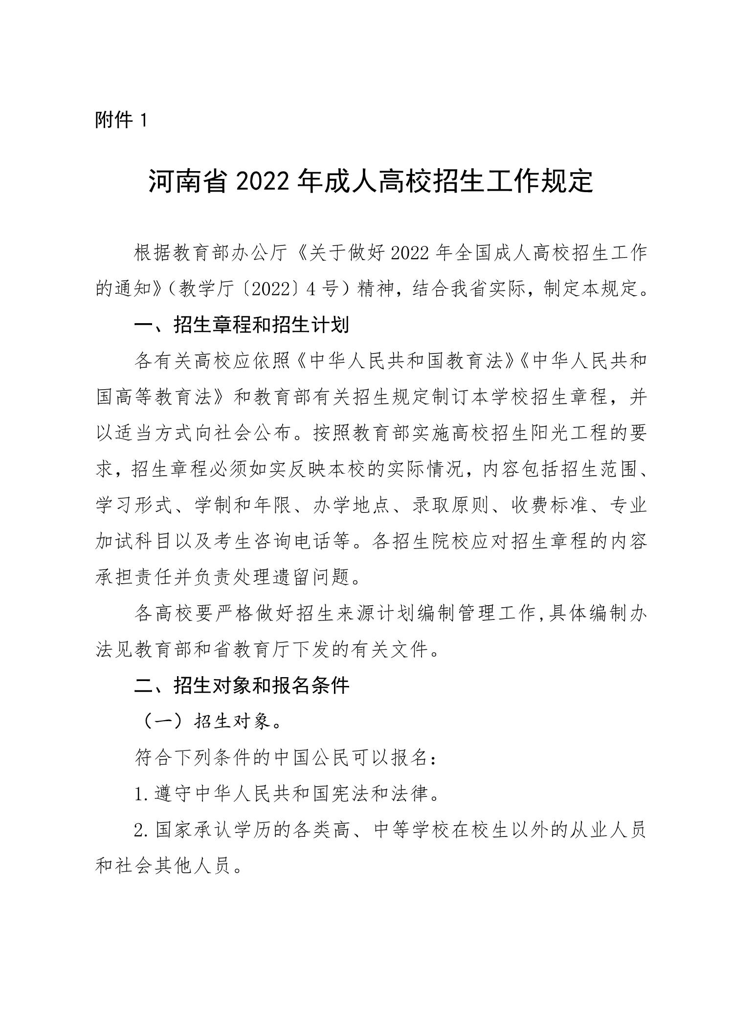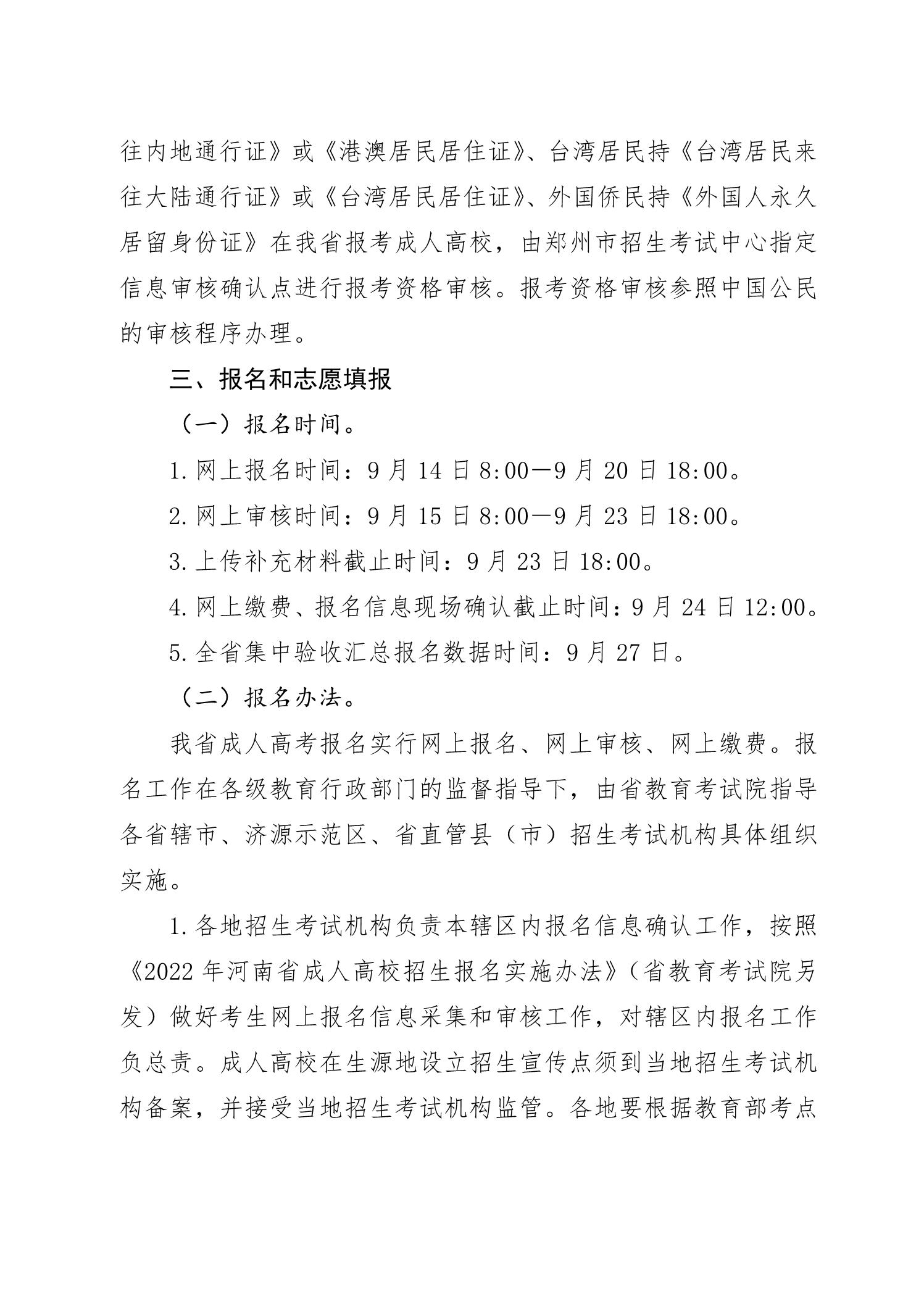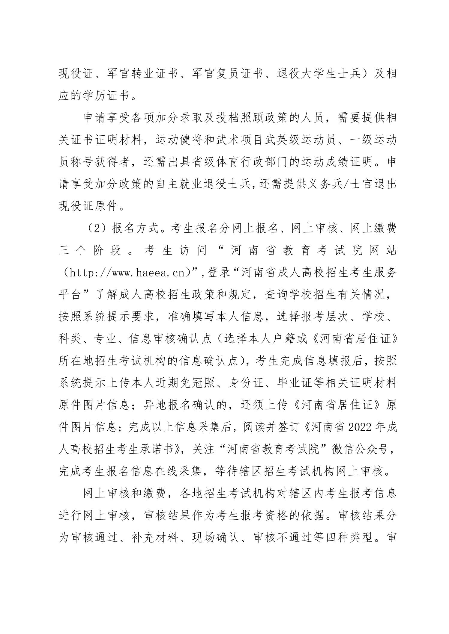 河南省2022年成人高校招生工作规定