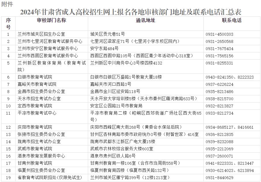 附件:2024年甘肃省成人高校招生网上报名各地审核部门地址及联系电话汇总表