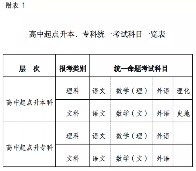 (五)高起本、高起专考试按文科、理科分别设置统考科目。公共课统考科目均为语文、数学、外语三门,其中数学分文科类、理科类两种,外语分英语、日语、俄语三个语种,由考生根据报考公司招生专业要求选择一种。报考高起本的考生, 除参加三门统考公共课的考试外,还需参加专业基础课的考试, 理科类专业基础课为“物理、化学”(简称理化),文科类专业基础课为“历史、地理”(简称史地)。(见附表 1)以上试题均由教育部统一命制。