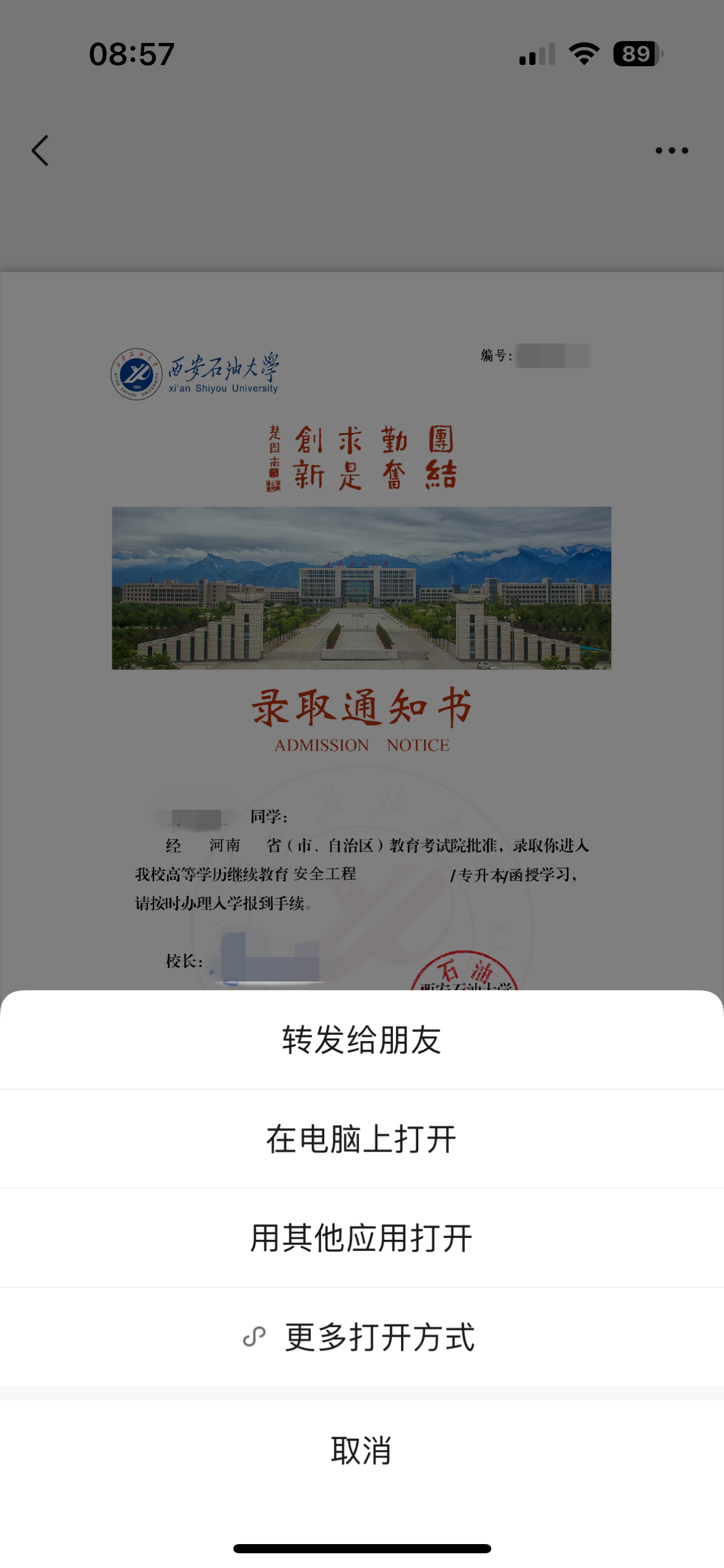 5. 页面显示完整录取通知书,点击右上角“…”,可选择将PDF格式的录取通知书转存至其他位置便于打印。