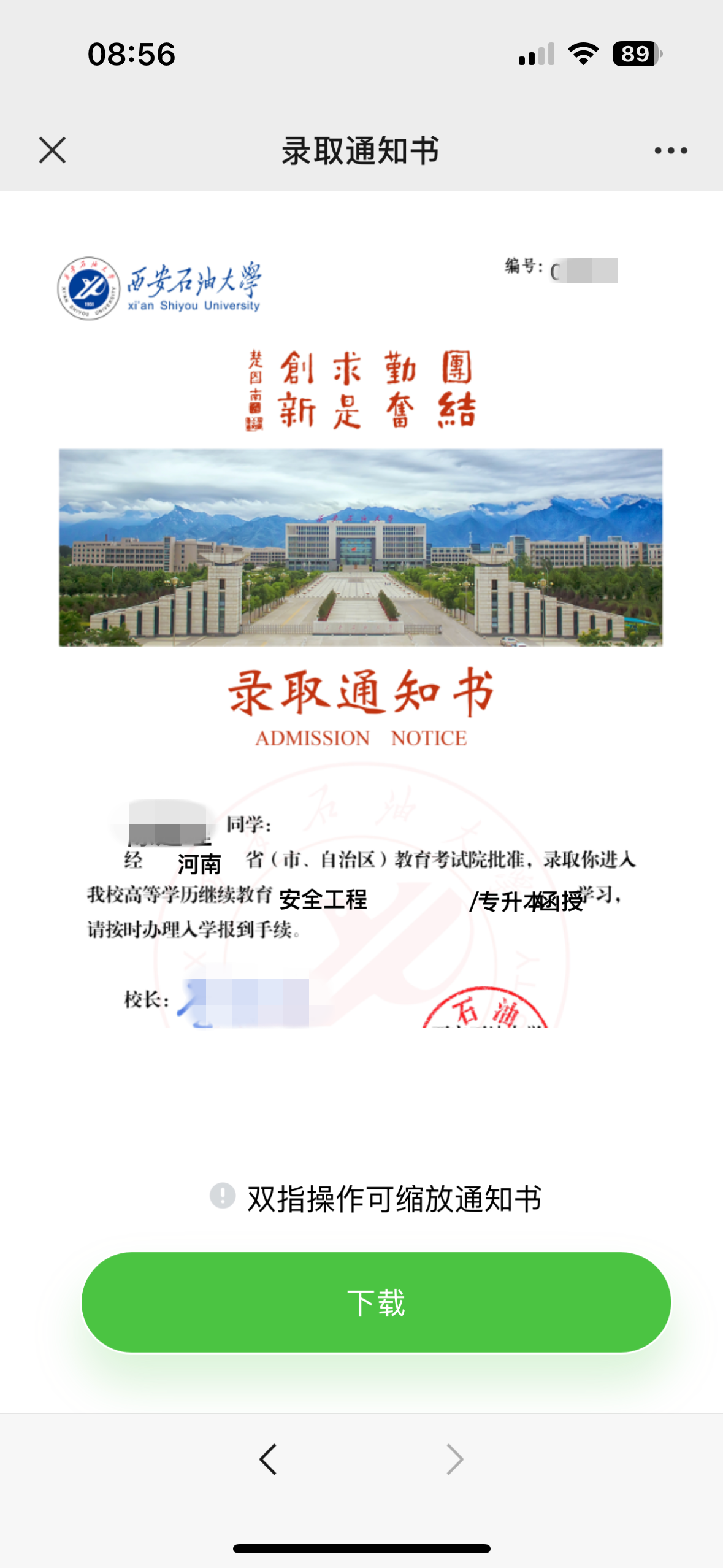 4. 页面显示录取通知书的预览图,点击“下载”。