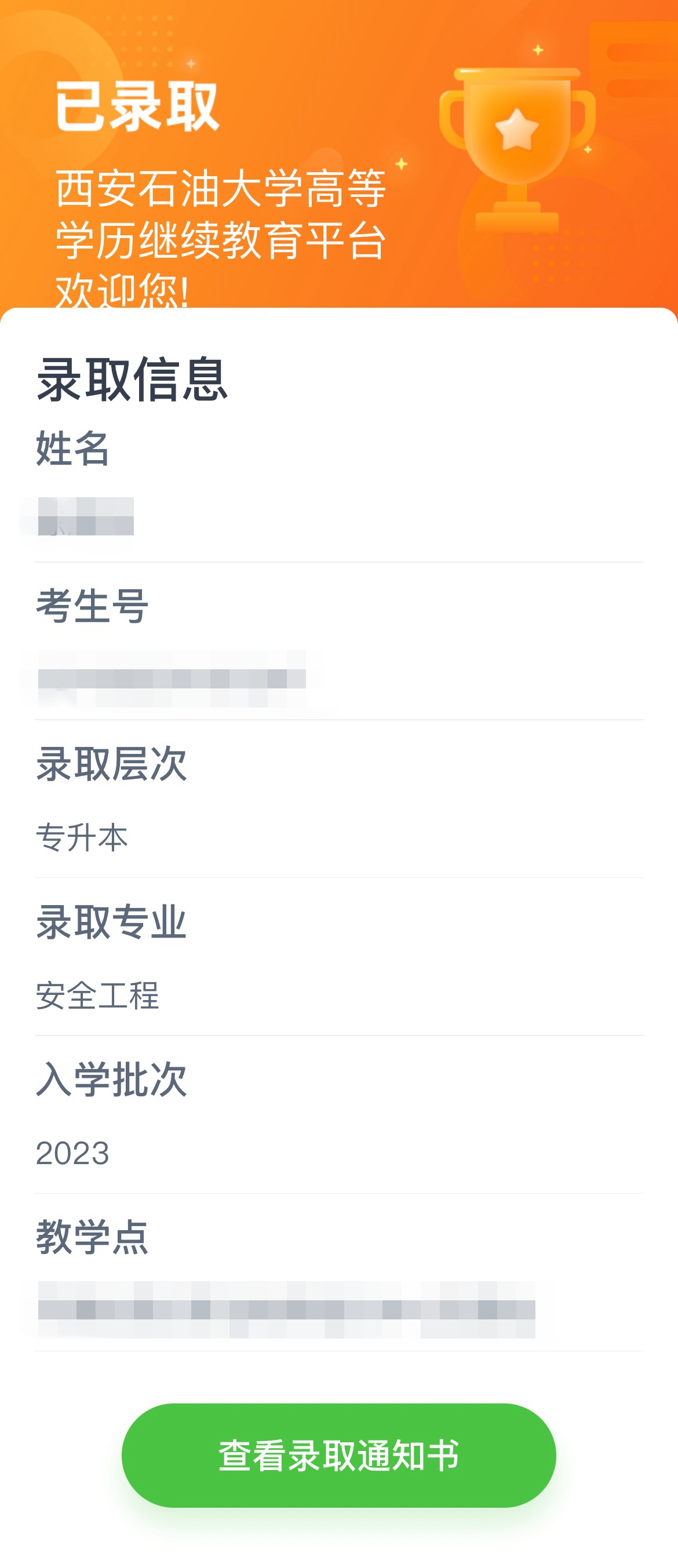 3. 页面显示新生个人信息,点击“查看录取通知书”。