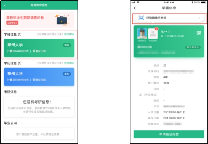 2. 学信网启用基于图像采集码的加密采集传输模式。学信网为每个员工提供专属加密的二维码(简称采集码),采集码中包含员工唯一编号,姓名、证件号码等毕业生图像采集所需的必要信息,其中姓名和证件号码进行脱敏处理。