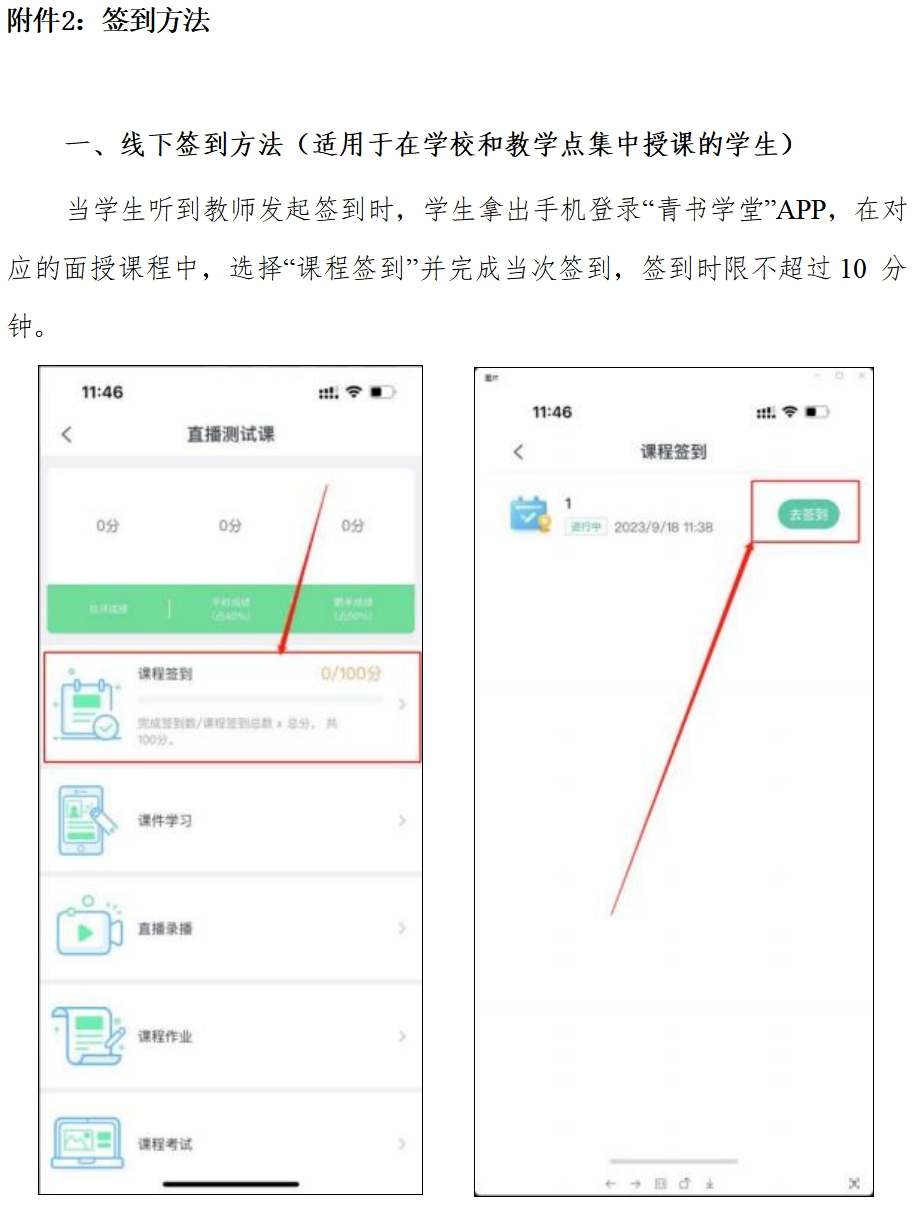 线下教学授课期间,员工都应根据教师提示通过“青书学堂”APP 进行课程签到,签到方法见附件 2 ,签到情况将纳入平时成绩。