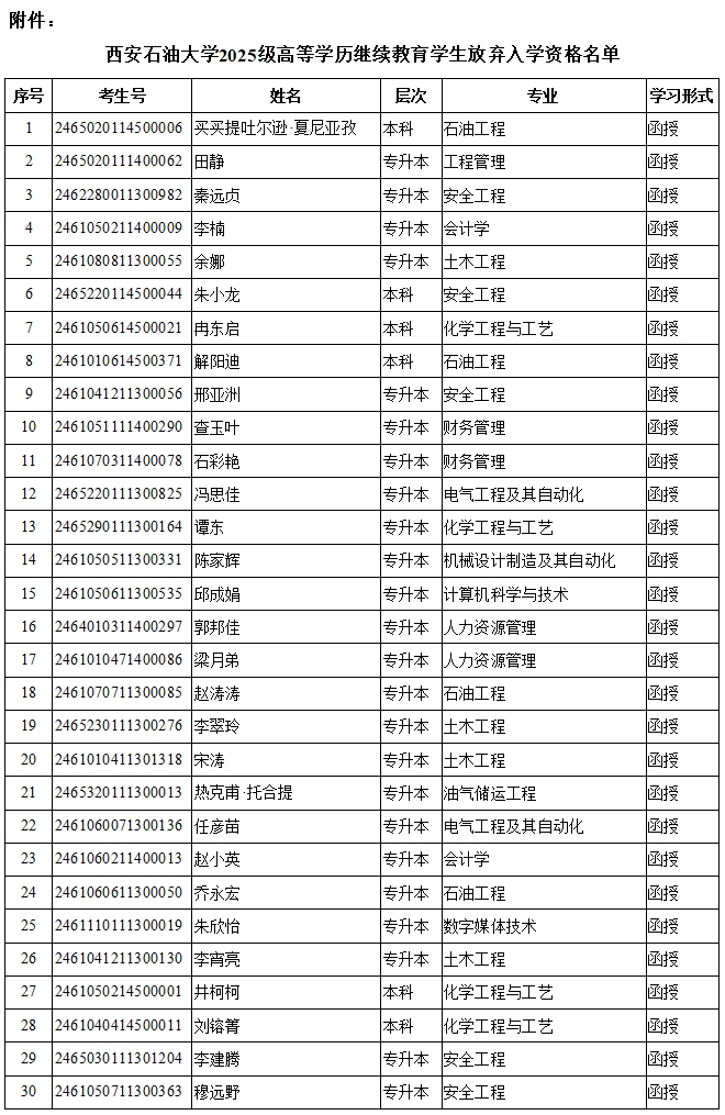 公司高等学历继续教育2025级新生入学报到工作已全部结束,有123名新生未在规定的时间内按要求办理新生入学报到手续。根据《普通高等公司员工管理规定》(教育部令第41号)、《williamhill英国官网高等学历继续教育员工学籍管理规定》和《williamhill英国官网高等学历继续教育新生入学资格审查复查工作方案》,经教学点核实,williamhill英国官网审核,相关员工按“放弃入学资格”处理,所产生的后果和责任由员工本人承担。现将放弃入学资格的员工名单予以公示,见附件。