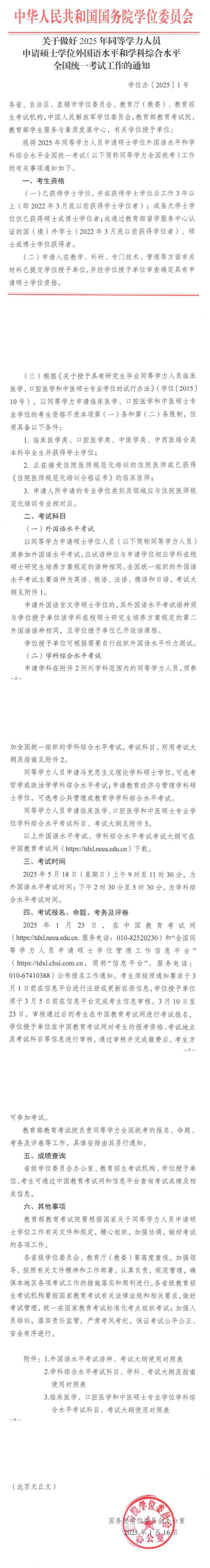 关于做好2025年同等学力人员申请硕士学位外国语水平和学科综合水平全国统一考试工作的通知